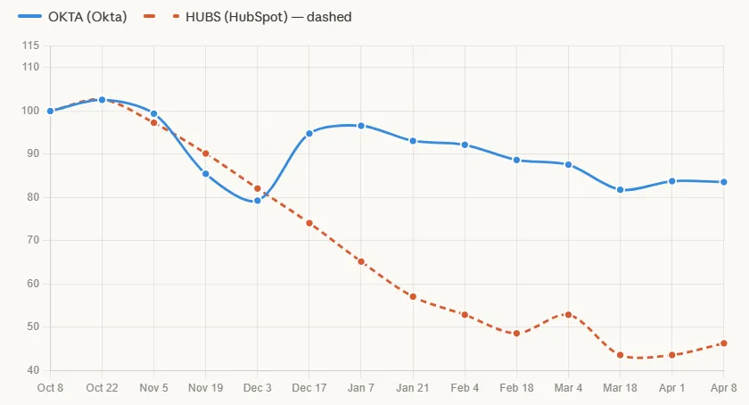 HubSpot lost more than half its market cap in the six months to April 2026. Okta declined roughly 16% over the same period. That is not a rounding difference. It signals that the market is making a distinction between SaaS companies where AI can plausibly replicate the core function, and SaaS companies where it cannot.