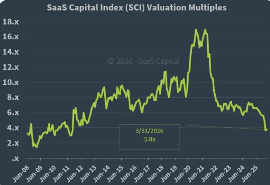 The chart below tells a clear story. The SaaS Capital Index peaked at 16.9x ARR in 2021, compressed hard through 2022 and 2023, and appeared to stabilize around 6-7x through most of 2024 and into early 2025. Then it resumed its fall. By March 2026, the index stood at 3.8x. There is no ambiguity about the direction.